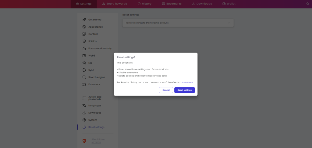 - This will reset your browser settings without deleting personal data like bookmarks or saved passwords.